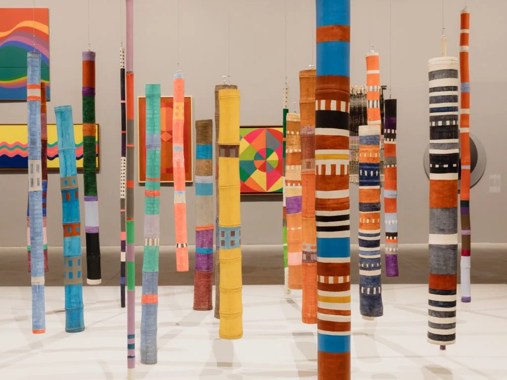 Painted bamboo forms arranged as immersive sculpture, exploring abstraction, repetition, and spatial rhythm.