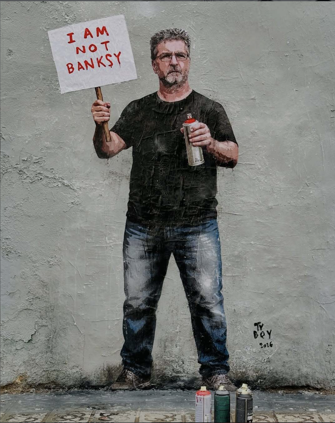This piece by Spanish street artist TV Boy plays directly into the long-standing cultural fascination with Banksy’s identity: one of the most persistent mysteries in contemporary art. For decades, Banksy has remained anonymous while achieving global recognition. Numerous theories have emerged, suggesting he could be individuals like Robin Gunningham, Robert Del Naja (of Massive Attack), or even a collective. Despite investigations, alleged leaks, and stylistic analyses, no definitive confirmation has ever been universally accepted. TV Boy’s work often blends pop culture, political commentary, and satire. In this piece, he inserts himself (or a character resembling an artist) into the narrative, humorously holding a sign that denies being Banksy. While visually embodying the stereotype of what people imagine Banksy to look like: a casual, middle-aged man with spray paint in hand. The artwork reflects a broader shift in how art is consumed today: - The story behind the artist can become as important as the work itself - Mystery and anonymity can function as powerful branding tools - The public participates in meaning-making through speculation and interpretation By parodying the obsession with Banksy’s identity, TV Boy redirects attention back to the absurdity of the question itself. The piece becomes meta-commentary. not just about Banksy, but about us as viewers. In a world where everything is documented, tracked, and exposed, Banksy’s anonymity feels almost rebellious. And this artwork captures that tension perfectly - half joke, half philosophy. Also adding - George Georgiou "Banksy" Misidentification summary for whoever might notice similarities: Context: Following a March 2026 Reuters investigation that identified artist Banksy as Robin Gunningham, speculation wrongly targeted a 69-year-old property manager from North London named George Georgiou. Incident: Georgiou was spotted near a Finsbury Park mural and mistakenly identified as the artist. Clarification: Georgiou clarified he is not Banksy and was merely familiar with the building owner. Investigation Result: Reuters confirmed that Gunningham, not Georgiou, is the street artist.