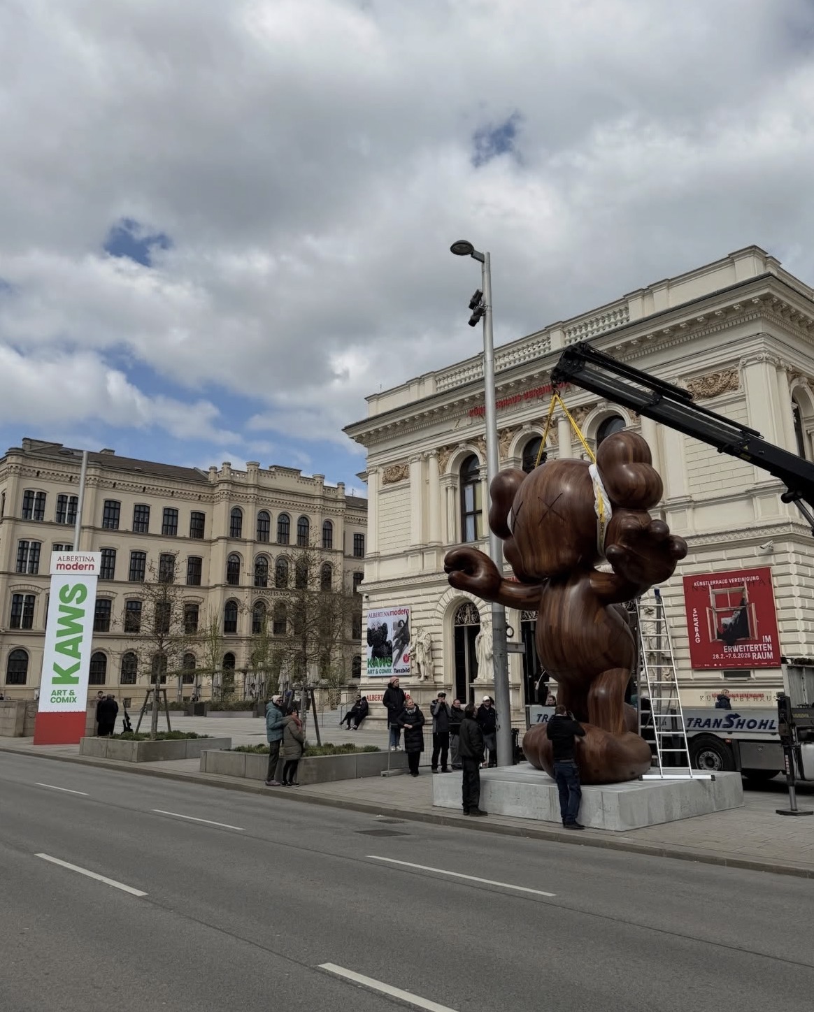 Before the exhibition even opens, it’s already happening outside. Suspended mid-air, not quite placed, not quite stable, this Companion feels strangely human. Like it’s arriving rather than being installed. There’s something poetic about catching it like this, in between states. KAWS characters often look emotionally paused, with those crossed-out eyes that feel less like anonymity and more like withdrawal. But here, hanging from a crane in front of a grand, classical façade, the contrast becomes louder. Soft cartoon body, heavy wood material, delicate gesture, industrial machinery. It almost feels like the city is negotiating with it. Old Vienna meets global pop culture, and neither fully wins. And maybe that’s the point. You don’t walk into this exhibition cold. You’re already inside it, just by passing by.