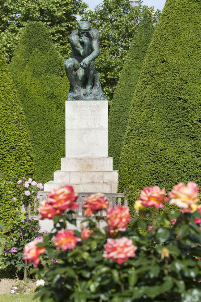 The Thinker sits in contemplation while visitors swirl around him. Rodin understood human struggle.