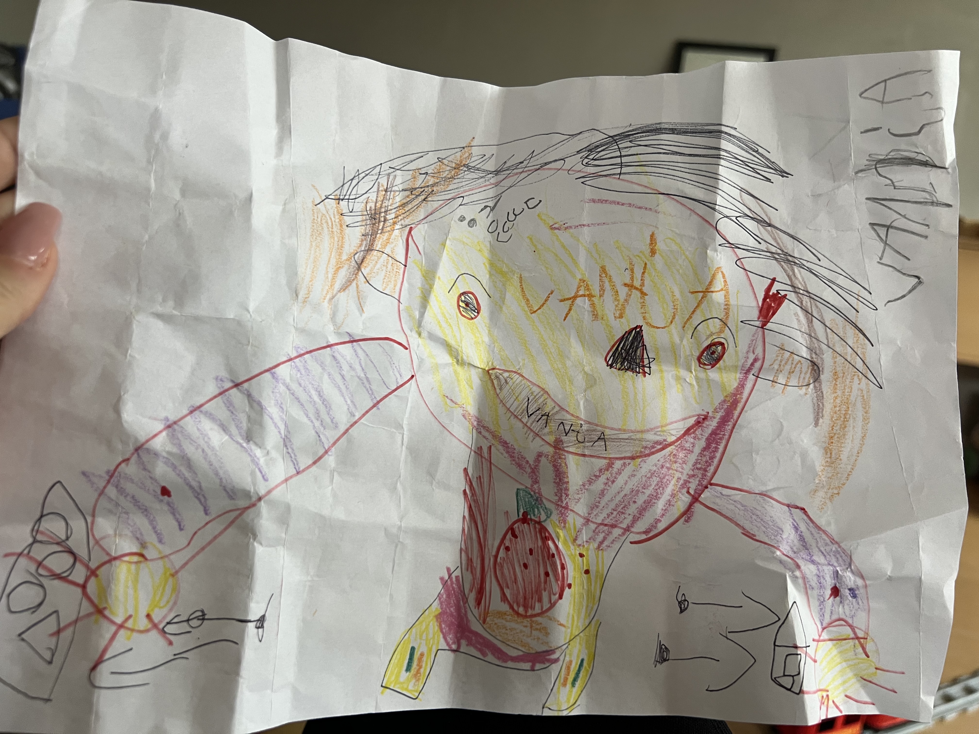 My son paints me in different shapes, colors and sizes, but this one is my favorite. So many details: nails, strawberry on a t-shirt. Just makes me wanna be that person all my life!
