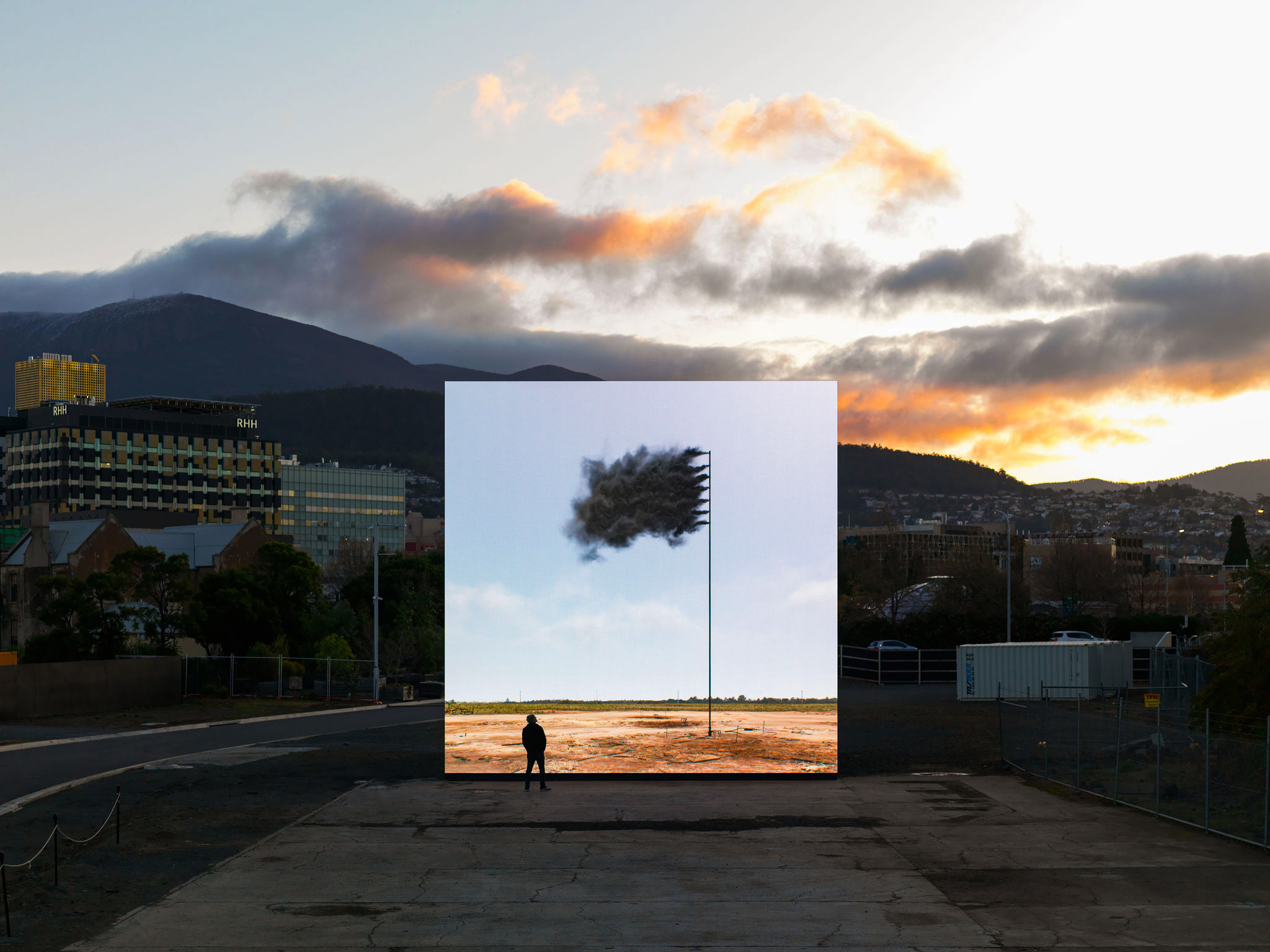 Western Flag (Spindletop, Texas) is a real-time digital simulation by John Gerrard set at Spindletop, Texas, the site of the 1901 oil strike that catalyzed the global fossil fuel economy. The work was originally commissioned by Channel 4 for Earth Day (2017) and first presented publicly at Somerset House as a large-scale outdoor LED installation. From there, it expanded beyond traditional exhibition formats, appearing as a television broadcast, a live online stream, and later as site-specific installations, including Desert X 2019 and presentations at Museo Nacional Thyssen-Bornemisza during global climate discourse moments like COP25. Unlike video art, the piece is not pre-recorded. It unfolds continuously in real time, synchronized with actual daylight cycles. The flag, made of smoke or fire, is endlessly generated yet never stable. It appears, dissolves, and reappears, emphasizing process over permanence. Conceptually, Gerrard replaces the national flag, traditionally tied to identity and territory, with a symbol of the carbon age. The image is inseparable from systems of extraction, production, and emission. What we are looking at is not representation, but consequence made visible. Its shifting modes of exhibition mirror its meaning. The work travels across screens, public spaces, and landscapes much like the systems it critiques. It is not confined, not static, and not easily contained.